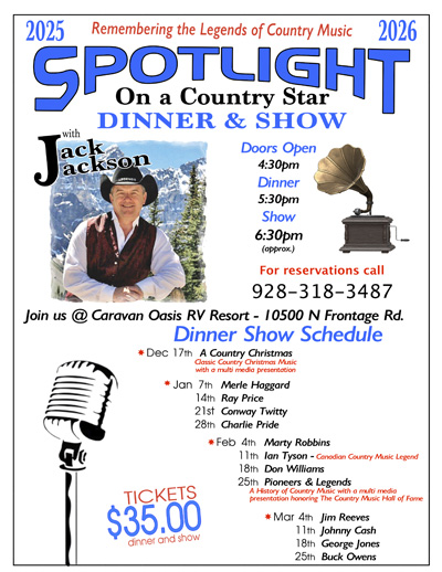 Through songs and stories, (sometimes sad… sometimes funny), seasoned performer and story teller “Jack Jackson”, will walk you through the musical careers of some of Country Music’s most “loved entertainers” as he honors their memory and musical legacy in Country Music History.